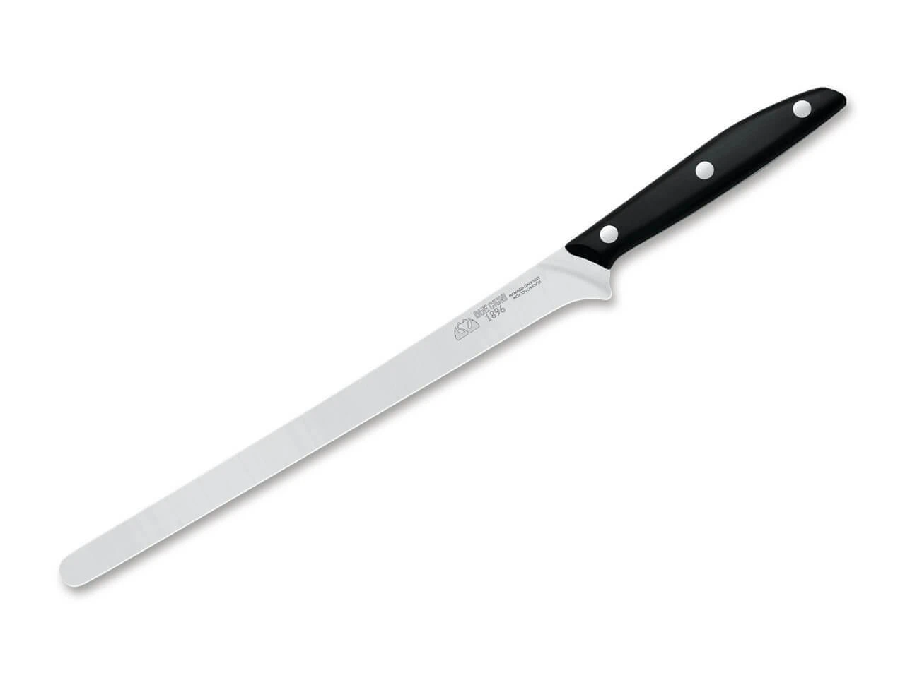 Mit der Serie 1896 stellt Due Cigni eine besonders hochwertige Küchenmesserserie vor, die das Sortiment des Herstellers aus der traditionellen Messerstadt Maniago krönt. Mit Griffen aus widerstandsfähigem POM liegt das Schinkenmesser ausgezeichnet in der Hand, wobei die klassische Vernietung die optische und haptische Balance perfektioniert. Für die Klingen kommt der bewährte X50CrMoV15 zum Einsatz, der Schnitthaltigkeit und Korrosionsresistenz perfekt vereint.