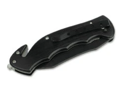 Dieses Messer wurde als modernes und funktionales Rettungsmesser entwickelt. Als Griffmaterialien wird griffiges und „warmes“ Forprene verarbeitet. Die Sheepfoot-Klinge mit gerader Schneide ist aus N690 gefertigt, somit extrem schnitthaltig, und mit ihrem partiellen Wellenschliff sehr vielseitig einsetzbar. Es verfügt außerdem über einen austauschbaren Glasbrecher und auswechselbare Gurtschneider-Klingen (jeweils eine Ersatzklinge und Wechselwerkzeug im Lieferumfang enthalten). Schwarzer Forprene-Griff und Gurtschneider.