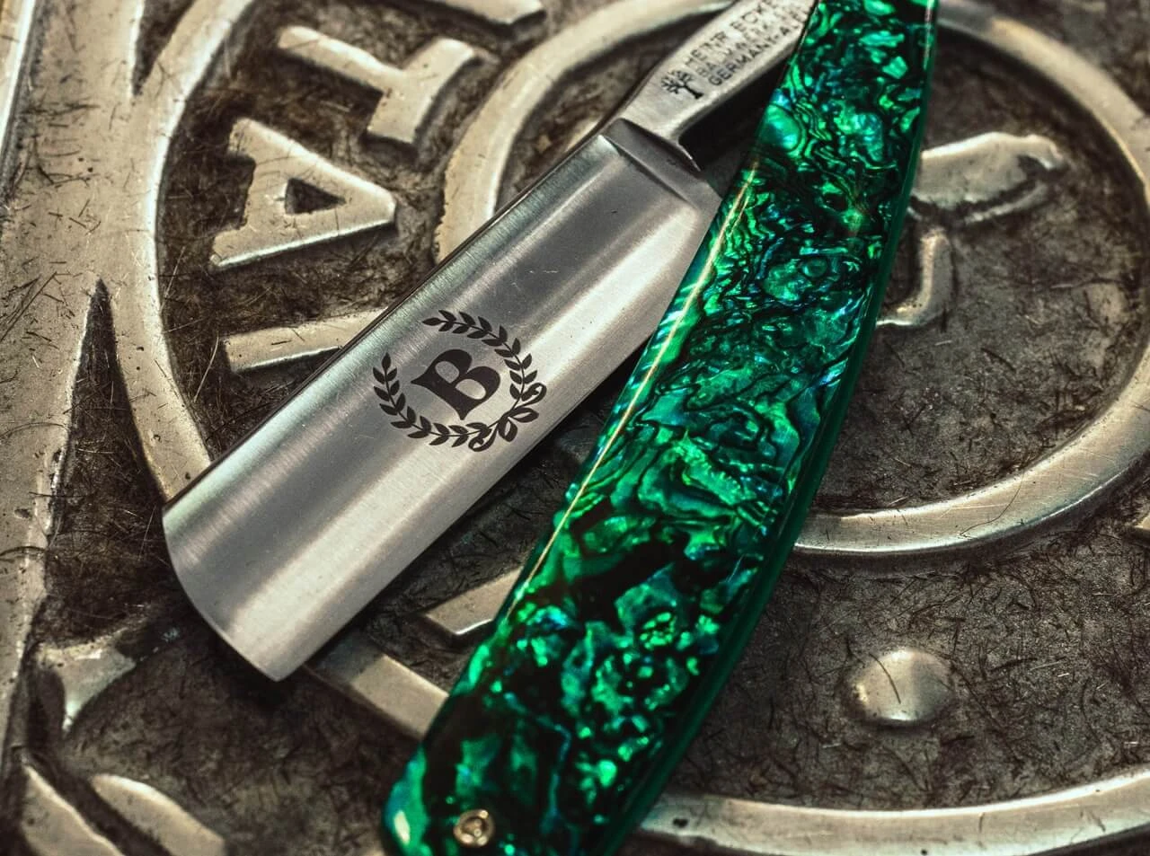 Die 6/8 Zoll breite Klinge dieses außergewöhnlichen Rasiermessers wird extra hohl auf Klang ausgeschliffen und mit einer beidseitigen Serrierung ausgestattet. Der französische Kopf der Rasiermesserklinge aus dem Kohlenstoffstahl O1 fügt sich harmonisch in das außergewöhnliche Heft aus Abalone ein. Die schlichte Lasergravur geht zurück auf eine historische Klingenätzung, die bereits Anfang des 20. Jahrhunderts für besonders ausgefallene Rasiermesser von Böker verwendet wurde. Auslieferung in einem hochwertigen Rahmenetui und mit Echtheitszertifikat.