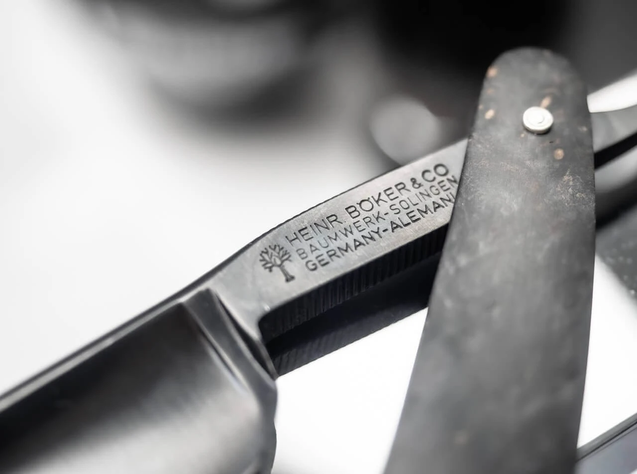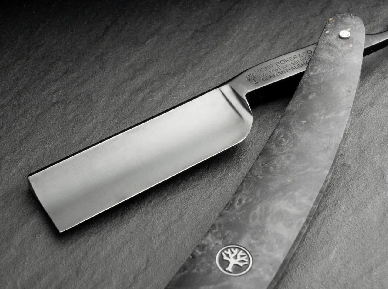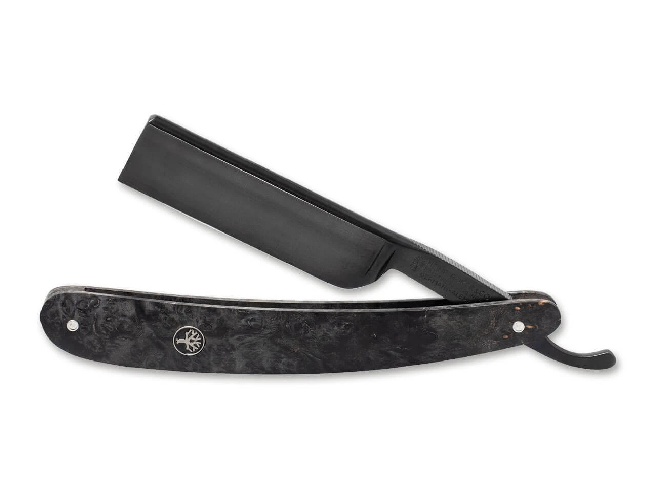Stil ist weniger eine Frage der Eleganz, sondern vielmehr des Charakters. Dass sich diese Eigenschaften hervorragend vereinen lassen, beweist das Böker Black Amboina in Vollendung. Das ausdrucksstarke 6/8 Zoll Rasiermesser ist komplett in Schwarz gehalten und wird erstmalig mit einer brünierten Klinge aus hochfesten Kohlenstoffstahl versehen. Bei diesem besonderen Verfahren wird die Oberfläche der Klinge durch die Behandlung mit Säure in eine schwarze Oxidschicht umgewandelt, weswegen hierbei nicht von einer Beschichtung im klassischen Sinne gesprochen werden kann. Die extrahohl geschliffene Klinge erhält eine beidseitige Serrierung am Klingengang und unterstreicht somit den exklusiven Charakter des Böker Black Amboina. Durch das ausgewogene Gewicht des Messers gleitet die Klinge äußerst angenehm und sauber über die Haut.