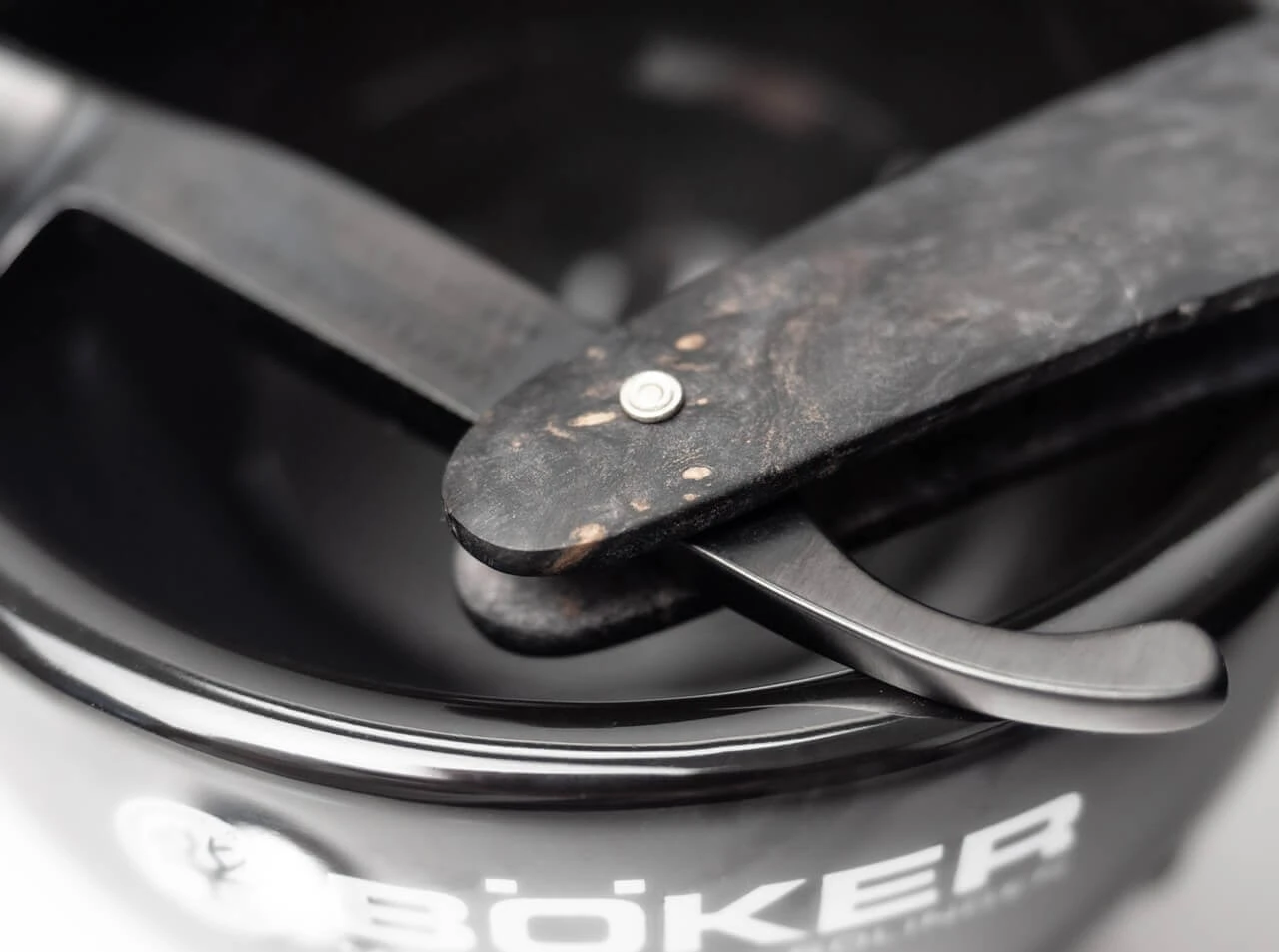 Diskrete optische Akzente im Heft finden sich als Blickfang in den beiden Nieten aus Neusilber sowie dem silbernen Böker Baumschild wieder. Mit authentischem Böker Stempel im Klingengang, Echtheitszertifikat und elegantem Schwebedisplay. Handgefertigt in der Böker Messer-Manufaktur Solingen.