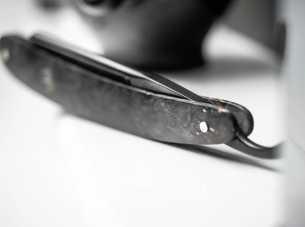 Das Heft aus exotischem Amboina Holz beeindruckt mit seiner auffällig zerstreuten Maserung, die in Teilen an wilde Kohlefaser erinnert. Diese besondere Struktur verdankt die aus Südostasien stammende Holzart seinen knollenartigen Verwachsungen im Bereich der Wurzeln, wodurch jedes Messer seinen einzigartigen Charakter erhält. Das markante Schwarz und die angenehm glatte Oberfläche des Hefts werden mit Hilfe der Stabilisierung des Holzes erreicht. Bei diesem speziellen Prozess wird erhitztes Epoxidharz in die Holzporen gepresst und anschließend ausgehärtet. Die bauchige Form des Hefts bildet einen gelungenen Kontrast zum Gradkopf der Klinge, womit die Linien des Rasiermessers ausdrucksstark betont werden.