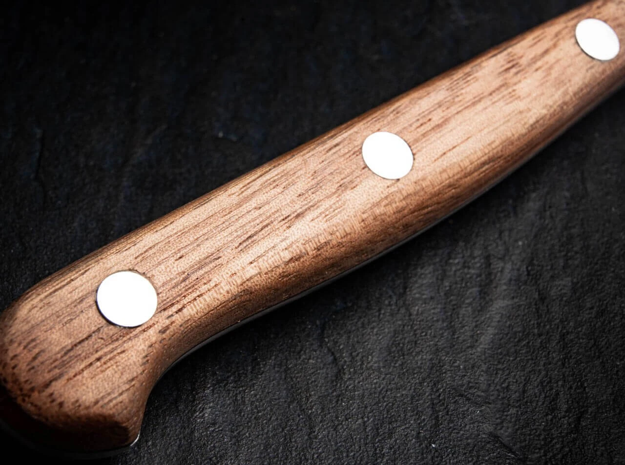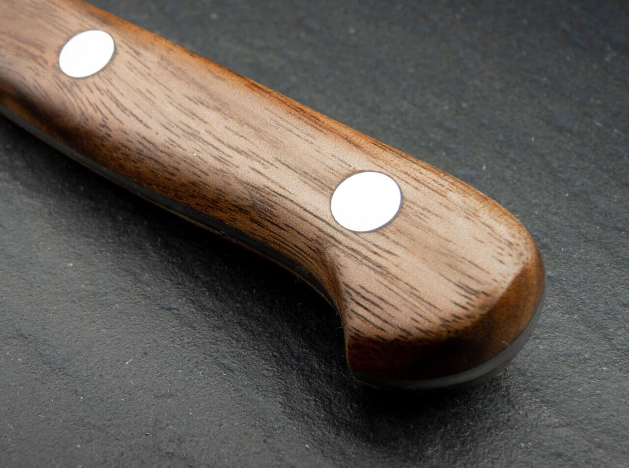 Die geschmiedete Kochmesser-Serie Böker Heritage macht ihrem Namen alle Ehre und tritt das Erbe der traditionellen Solinger Kochmesser an. Das klassische Drei-Nieten-Design wird dafür mit hochwertigen Materialien ausgestattet und führt die perfekte Verarbeitung fort, durch die Solinger Schneidwaren in den letzten Jahrhunderten auf der ganzen Welt bekannt geworden sind. So werden die Klingen der außergewöhnlichen Messer in Vollerl-Bauweise aus X50CrMoV15 gefertigt, der ein ausgewogenes Verhältnis von Schnitthaltigkeit, Rostträgheit und guter Nachschärfbarkeit bietet. Durch die aufwendige Schmiedung in Solinger Handarbeit wird der massive Klingenrohling zusätzlich im Gefüge optimiert, anschließend auf ungefähr 58 HRC gehärtet und zuletzt mit einem feinen Satin-Finish versehen. Die ergonomisch geformten Griffe aus heimischem Walnussholz liegen sehr angenehm in der Hand und vervollständigen das stimmige Gesamtbild. Der geschmiedete Kropf bietet jederzeit einen sicheren Griff, schützt wie der integrierte Knauf vor möglichen Verletzungen und sorgt für eine perfekte Balance.