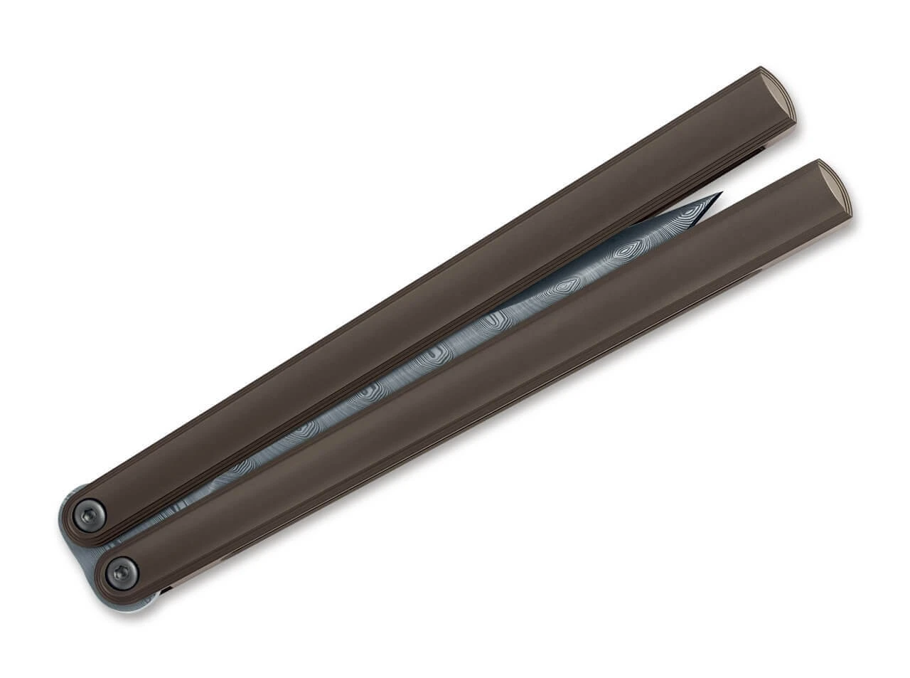 Das Fox PHI greift die Wurzeln der philippinischen Balisong Messer auf und erhält durch Designer Vincenzo Fiore eine moderne Interpretation. Typisch für diese auch „Butterfly“ genannten Messer sind die um 180° schwenkbaren Griffhälften, die beim Fox PHI aus bronzefarbenem Titan bestehen im Sinne einer ausgewogene Gewichtsverteilung nicht über die üblichen kreisförmigen Aussparungen verfügen. Für ein aufgeräumtes Bild sorgt zudem das Fehlen des sonst üblichen Sicherungsstifts am Griffende, wodurch das Messer elegant schlank ausfällt. Bei der Klinge setzt das PHI auf den edlen Super Dense Twist Damast von Damasteel, der dank hoher Verschleißfestigkeit und Zähigkeit äußerste Zuverlässigkeit beim Schneiden verspricht.