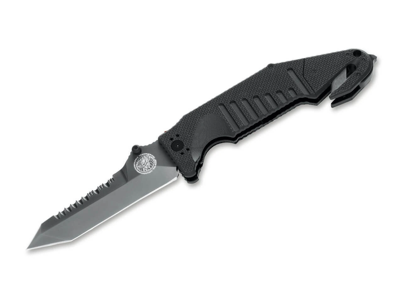 Dieses Messer bietet den Fallschirmjägern der Italienischen Folgore-Einheit eine Kombination aus Rettungs- und Einsatzmesser, mit Glasbrecher, Gurtschneider, einer Tantoklinge mit einem zusätzlichen Wellenschliff auf dem Rücken und einem großzügig dimensioniertem G10-Griff. Die schwarz DLC-beschichtete Klinge aus N690 ist satte 5 mm stark und ist somit für härteste Beanspruchungen ausgelegt. Funktional ausgelegt sind auch der umsetzbare Clip, die Fangriemenöse oder das Cordura-Etui. Um ein Maximum an Sicherheit zu gewähren, wird der Linerlock noch zusätzlich durch eine LAWKS Sicherung verstärkt.