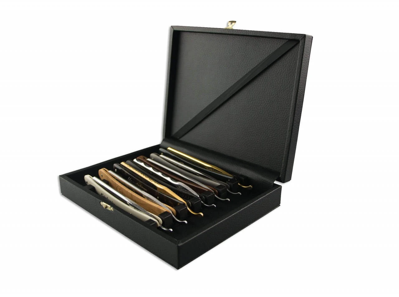 Die empfindliche und hauch-feine Wate (Schneide) des Rasiermessers richtet sich bei ausreichend langer Ruhezeit weitgehend von selbst wieder auf. Lässt man der Schneide nach der Rasur also ausreichend Zeit sich zu erholen, minimiert man den Pflegeaufwand und erhöht die Lebensdauer des Rasiermessers. Vom 19. Jahrhundert bis in die 30er-Jahre waren daher Wochensätze verbreitet in denen sieben baugleiche, mit den einzelnen Wochentagen gekennzeichnete Rasiermesser in einer Holzkassette zusammen-gefasst waren. Mit der Böker Wochensatz-Kassette kann der Liebhaber und Sammler sich nach und nach seinen eigenen Wochensatz je nach Vorliebe einheitlich oder aus verschiedenen Modellen zusammenstellen. Für größere Unempfindlichkeit gegenüber Feuchtigkeit haben wir bewusst auf die Verwendung von Echtleder verzichtet und das Holz stattdessen mit hochwertigem synthetischem Leder in aufwen- diger Wickeltechnik innen und außen kaschiert. Die Stege mit den sieben Rasiermesseraufnahmen sind zur schonenden Aufbewahrung weich und rutschfest gepolstert. Mit diagonalem Ripsband im Deckel und dekorativen Beschläge aus Messing. Lieferung ohne Rasiermesser. Maße: 220 mm x 175 mm. Die Innenhöhe beträgt 30 mm.