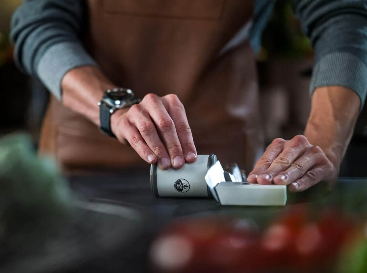 Das Runde gehört ans Eckige – der innovative Rollschleifer HORL 2 Cruise macht das Schärfen von Messern so einfach wie nie zuvor. Das Konzept des manuellen Messerschärfers ist hierbei so einfach wie genial. An den Enden der Rollwalze befinden sich jeweils eine Diamant Schleifscheibe für den Hauptschliff und eine Abziehscheibe aus Edelstahl zum Verfeinern des Schliffbildes. Gehalten wird das Messer an der mitgelieferten Magnetschleiflehre im Winkel von 20°. Die Gummifüße verhindern ein Verrutschen der Führung, so dass es beim Schärfen ab jetzt immer rund läuft. Dank der leicht rollenden Walze und den breiten Gummiringen erhält jedes Messer beim Entlangrollen des HORL 2 Cruise einen gleichmäßigen Schliff. Made in Germany und garantiert ein Kandidat für die HORL of Fame.